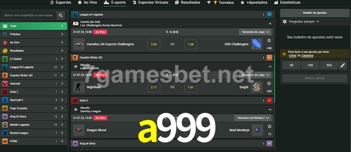 O a999 oferece uma grande seleção de opções de apostas em e-sports com probabilidades competitivas